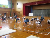 準備運動を行った後、素早く各色団のマットに移動し、かえる逆立ち、ブリッジ、背支持...