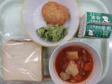 今日の献立は、食パン、牛乳、かぼちゃコロッケ、アスパラサラダ、ポークビーンズ で...