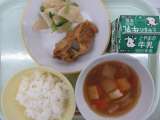 今日の献立は、ご飯、牛乳、魚のえごま揚げ、かぶのいろどり、根菜汁 です。