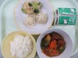 今日の献立は、ご飯、牛乳、えびパオツ、大根のナムル、酢豚 です。