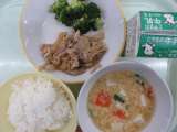 今日の献立は、ご飯、牛乳、豚肉のジャンロー、ゆでブロッコリー、かき玉汁 です。