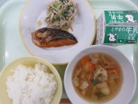 今日の献立は、ご飯、牛乳、ふくらぎの照り焼き、香味和え、白玉汁 です。