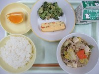 今日の献立は、ご飯、牛乳、千草焼き、ブロッコリーのごまだれ、韓国風すきやき、...