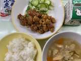 1学期最後の給食です。 ごはん 豚肉と大豆の甘からめ そえ野菜 五目味噌汁 味付...