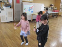 今日は、ボールを蹴って相手にパスをしたり、ゴールに見立てたコーンの間に向かって蹴ったりしました。友達の手本をよく見て、ボールを止める、蹴るを意識して練習しました。