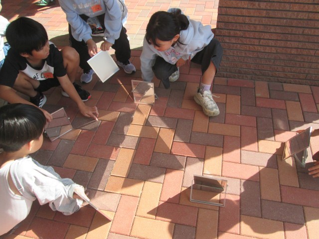 理科「はね返した日光」の学習で、鏡を使って日光をはね返す実験をしました。日かげに当てるとその部分が明るくなることや、はね返した日光を地面にはわせて、日光がまっすぐ進むことも確認できました。