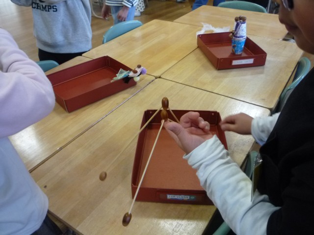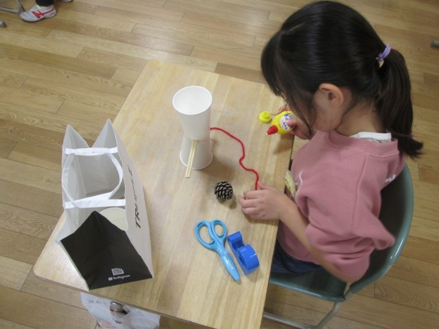 どんぐりや松ぼっくりなど、見つけてきた秋のものを使っておもちゃを作りました。楽しいおもちゃがたくさんできました。