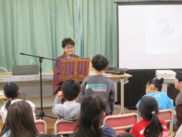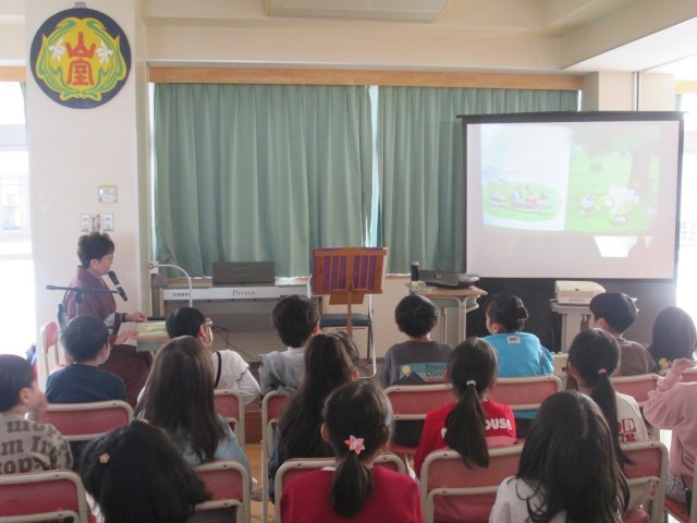朗読会がありました。いろいろな物語を聴いたり、一緒に掛け声をかけたりして楽しく参加しました。