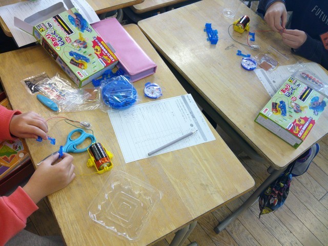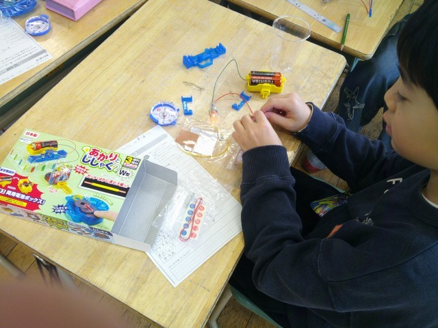 理科で「電気の通り道」の学習をしています。豆電球と乾電池と銅線で回路をつくり、どんな物が電気を通すのか実験しました。スチール缶やガラスのコップ、プラスチックの定規やつまようじなど、いろいろな物を試してみました。
