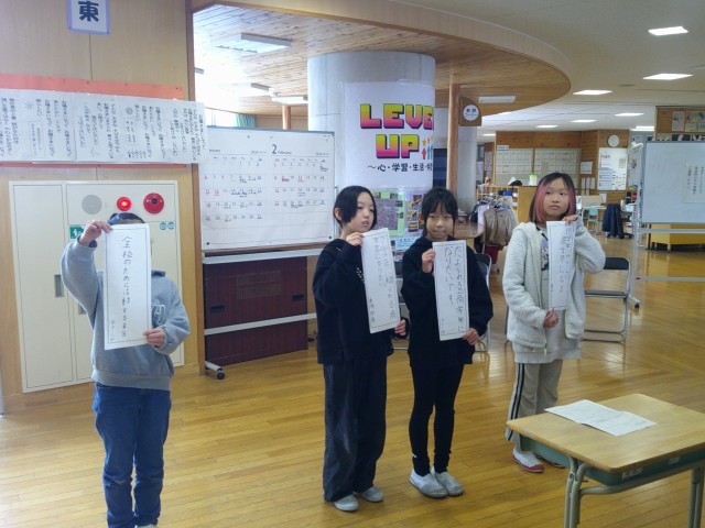 2月7日の学習発表会で、総合の時間に取り組んできた、「エコレベルアップ」と「高学年にレベルアップ」を保護者の方々に発表しました。