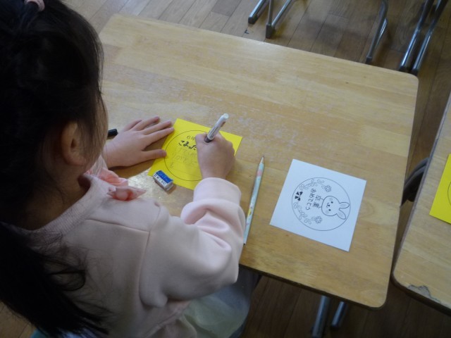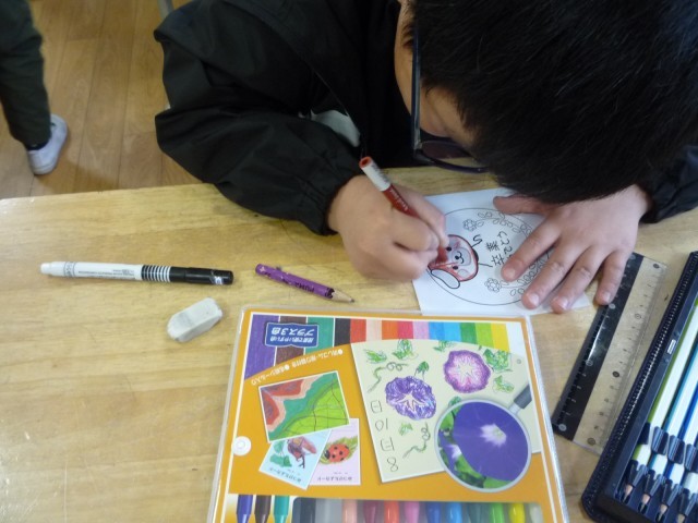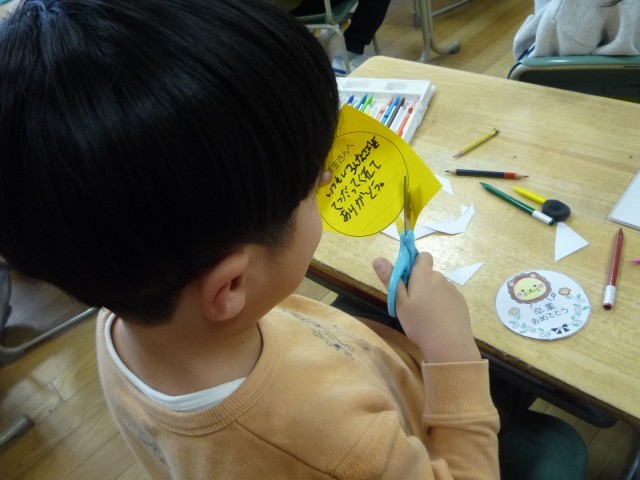 「卒業を祝う会」で6年生に送るメダルを作りました。感謝の気持ちを込めてメッセージを書いたり、色を塗ったりしました。