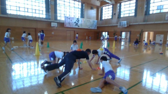 体育科の授業では、はじめに「体つくり運動」を行いました。5種類の運動を通じて、自分には得手、不得手の動きがあることに気づいていました。