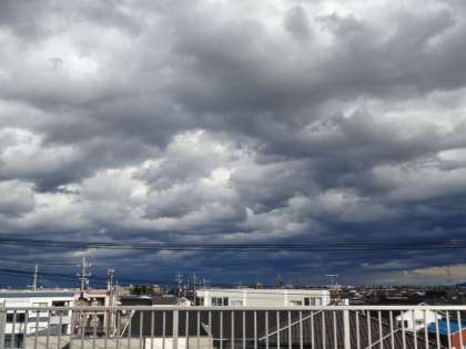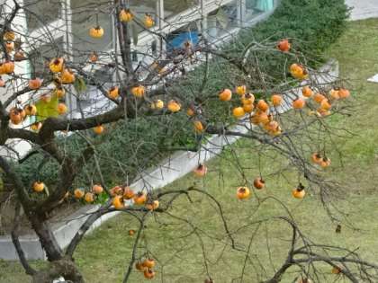 昨日はよい天気でしたが、今日は午前中から怪しげな黒い雲が空を覆っていました。中庭の柿の実も寂しい感じです。