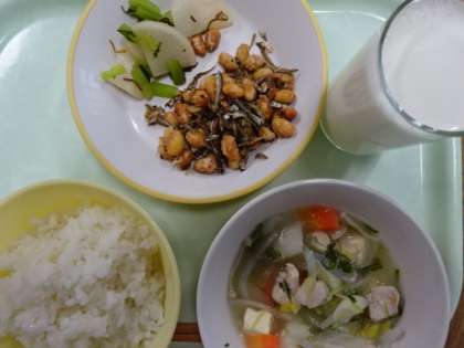 ごはん、牛乳、塩こうじ鍋、小魚入りフライビーンズ、かぶの昆布和えでした。寒くなってくると、鍋がおいしいですね。
