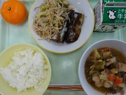 ごはん、牛乳、豚肉のじゃがいものうま煮、さんまの土佐煮、ビーフンソテー、みかんでした。