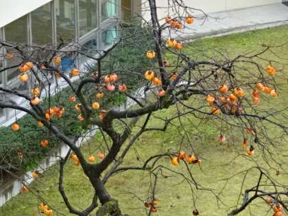休み明けの今日は、冷たい雨が降っています。中庭の柿の実も冷たそうです。