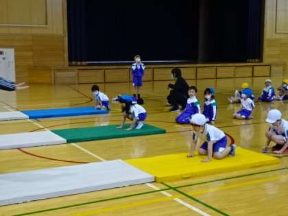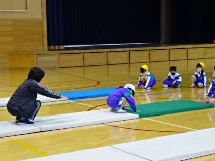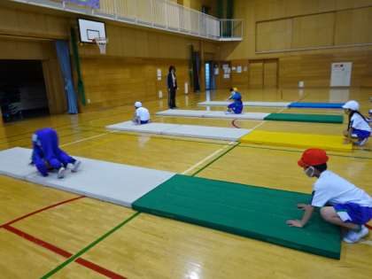 マット運動の前転です。まず、しっかり手をマットにつけましょう。きれいな前転ができるのは誰かな。