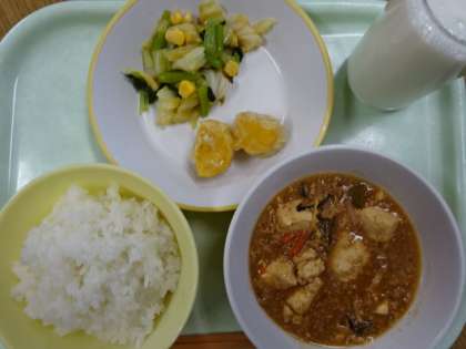 ごはん、牛乳、麻婆豆腐、にんじんシューマイ、コーン和えでした。