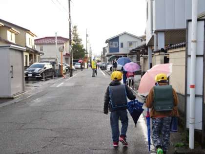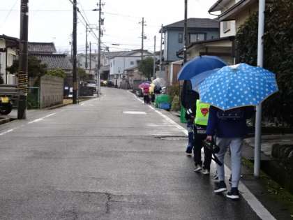 朝は小雨が降っていました。子供たちは、かさをさしながら、安全に気を付けて登校してきました。