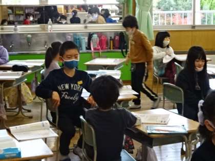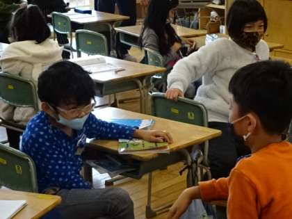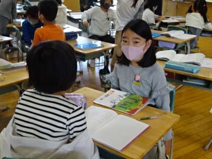 かけ算の7の段がしっかり覚えられたか、ペアで確認し合っています。