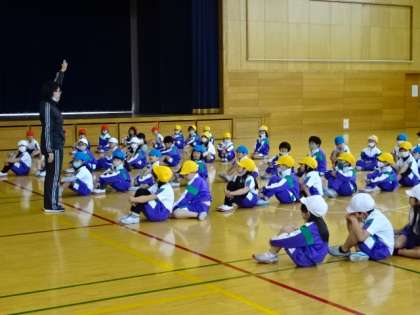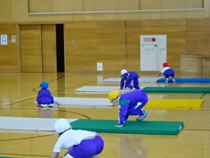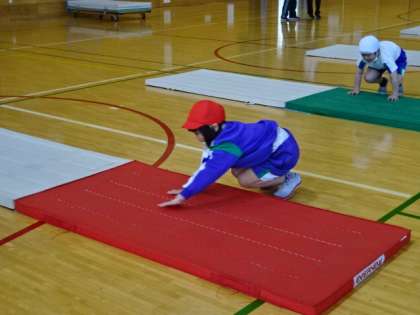 マット運動。今日は、マットを横に跳び越していく運動です。うまく跳び越せたかな?