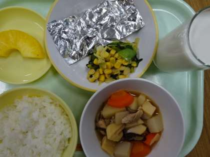 ごはん、牛乳、大和煮、さばの銀紙焼き、チンゲンサイソテー、カットパインでした。