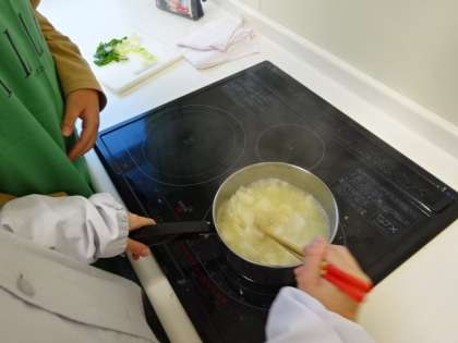 調理実習です。今日は、みそ汁を作りました。出汁をとって、大根とねぎのみそ汁です。おいしくできたかな?