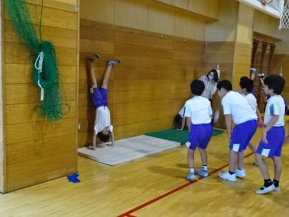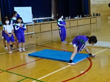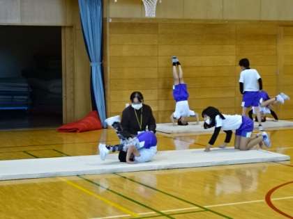 マット運動に取り組んでいます。手足をピンと伸ばして、より美しく!