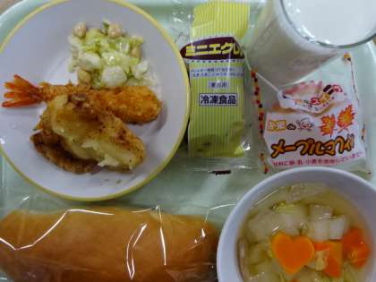 米粉コッペパン、牛乳、ひよこ豆のサラダ、野菜スープ。そして、選択献立として、豚肉のフリッターorえびフライ、メープルマフィンorエクレアでした。どちらを選んでもおいしいのでした。