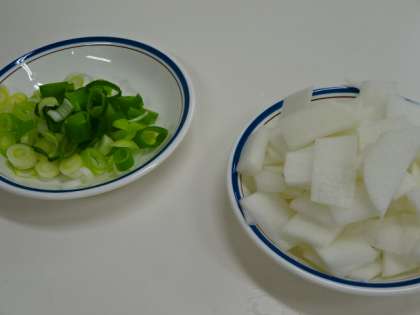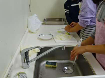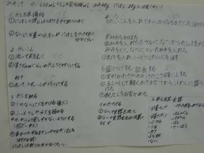 にぼしとかつおぶしで出汁をとり、大根とネギのみそ汁です。計画書にしたがって、協力して作っています。