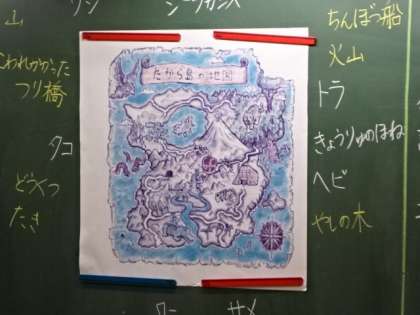 たから島の地図、ここからどんな物語ができてくるかな。大冒険物語?