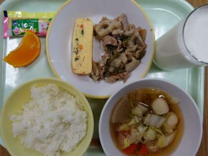 ごはん、牛乳、千草焼き、れんこんきんぴら、すりみ汁、あいか、納豆でした。あいかはオレンジの一種で、おいしかったです。納豆はチューブに入っていました。