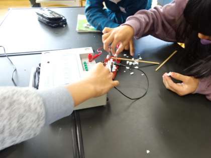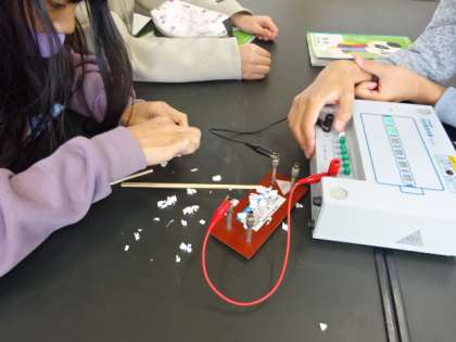 電流と発熱の関係、ニクロム線の太さと発熱の関係を調べています。