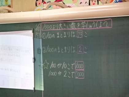 1000より大きい数の学習です。だんだん数字が大きくなってきましたね。大きなまとまりがいくつあるかな?