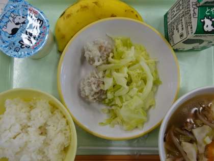 ごはん、牛乳、ゆでキャベツ、ワンタンスープ、珍珠丸子、ヨーグルト、バナナでした。