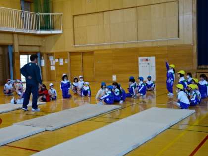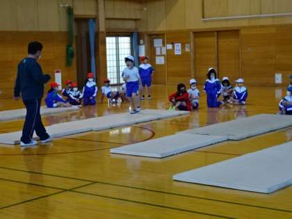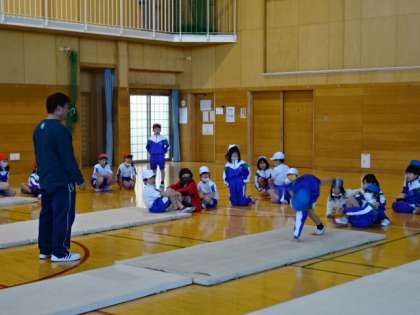 マット運動。うで立て側転に挑戦!みんなの前でやってみたいという子もいます。