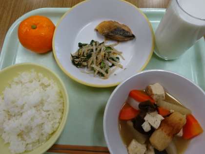 ごはん、牛乳、さむらいのおでん、さばのみそ煮、ごまあえ、みかんでした。「さむらいのおでん」というのは、「おでんさむらい」シリーズに登場する具材を使用しているからだそうです。ちくわや昆布巻きが入っています。