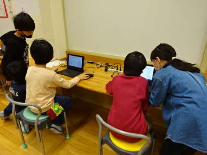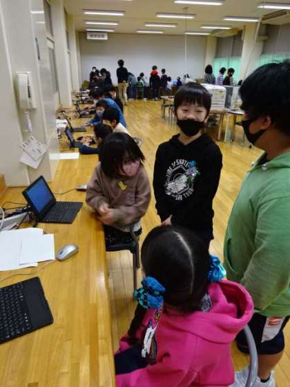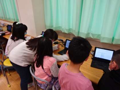 5年生が2年生に、パソコンの使い方を丁寧に教えています。上級生の腕の見せどころです。