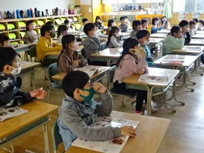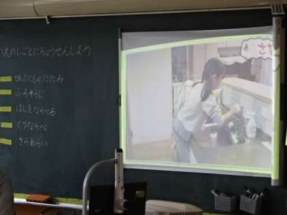 家の仕事に挑戦しよう。みんな画面に食いつくように見ています。