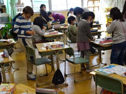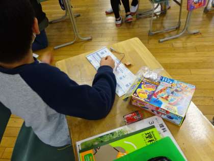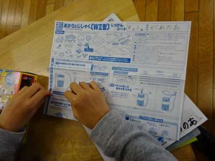 説明書を見ながら作っています。「銅線を〇センチに2本切って・・・」説明書通りに作るというのは、簡単そうで結構難しいものです。そんな時は、友達と確認しながら作っています。