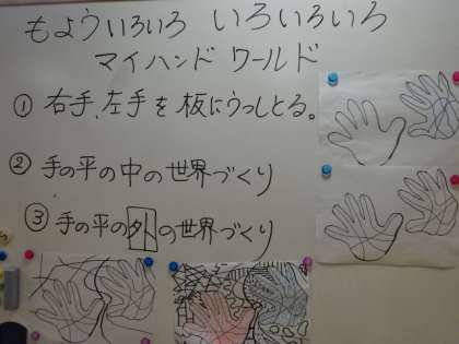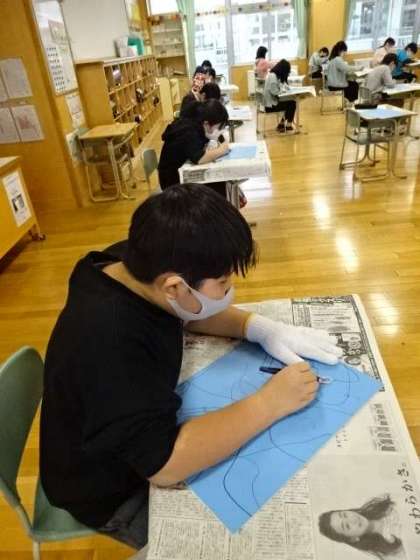 木版画に取り組んでいます。テーマは「マイ ハンド ワールド」みんな黙々と真剣に彫っています。