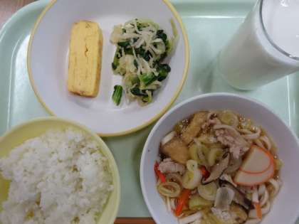 2月最初の給食は、ごはん、牛乳、かやくうどん、厚焼き卵、はりはり和えでした。