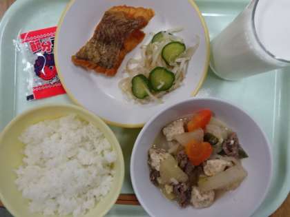 ごはん、牛乳、揚げ魚のレモン味、塩ナムル、牛肉と大根のごますき煮、節分豆でした。