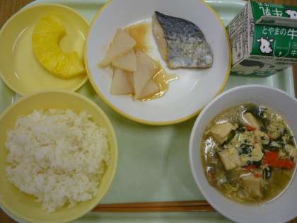 ごはん、牛乳、中華かき玉汁、鰆の塩焼き、あんばやし、カットパインでした。