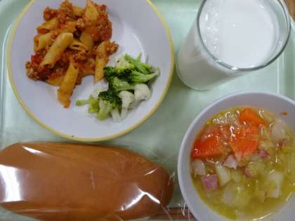 コッペパン、牛乳、ペンネのミートソース、そえ野菜、ポトフでした。