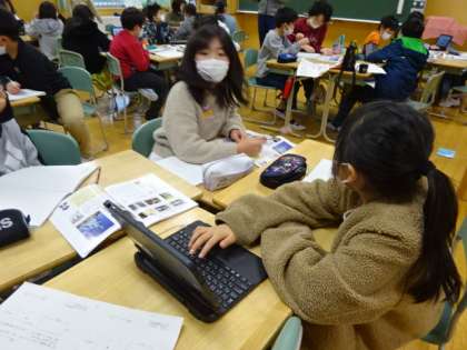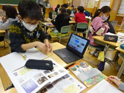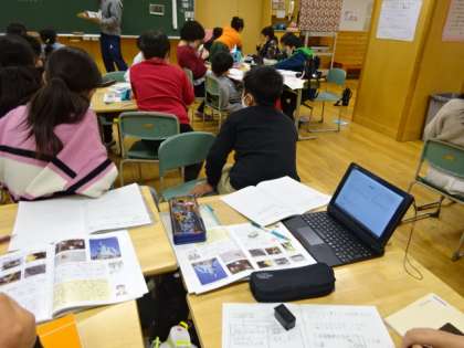 各教室でのwi-fi環境が整い、タブレット型パソコンを使えば、コンピュータ室に行かなくても、インターネットがつながるようになりました。早速、4年生が自分たちの机の上にパソコンを置いて、社会科の学習を進めていました。