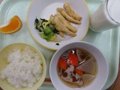 ごはん、牛乳、小いわしの天ぷら、昆布和え、こんこん汁、いよかんでした。こんこん汁には、大根、にんじん、れんこん、ごぼうの根菜が入っていました。