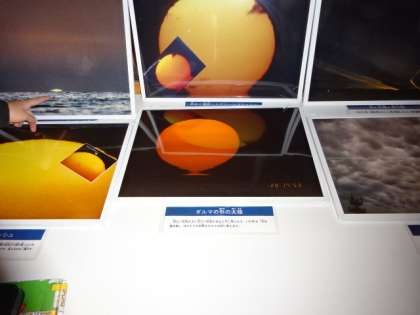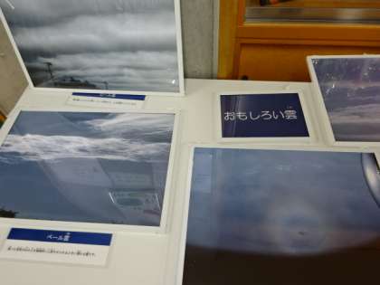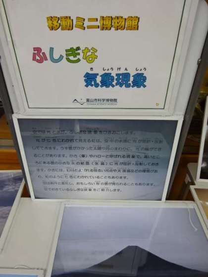 移動ミニ博物館。今回は「不思議な気象現象」の写真を児童玄関に展示してあります。
