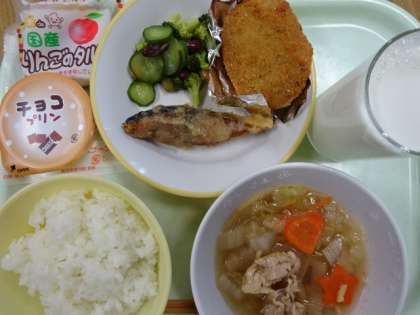 今日は、選択献立です。「魚の甘みそかけ」と「肉じゃがコロッケ」、「りんごタルト」と「チョコプリン」のどちらかを選びます。あとは、ごはん、牛乳、ビーンズサラダ、春雨スープでした。