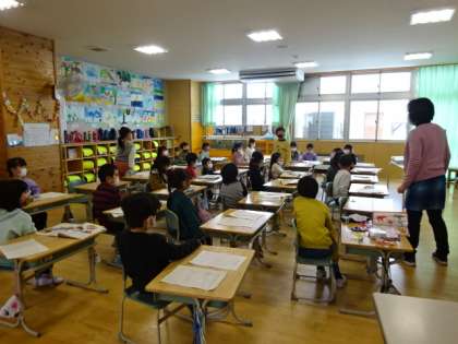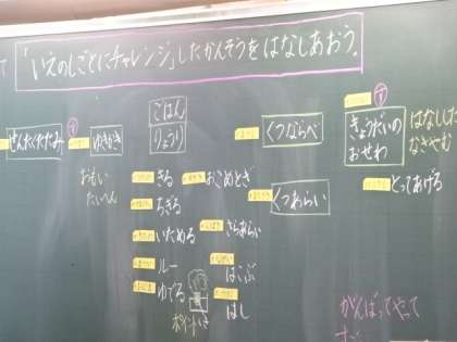 「家のしごとにチャレンジ」その結果を話し合っています。どんなことをしたのかな?